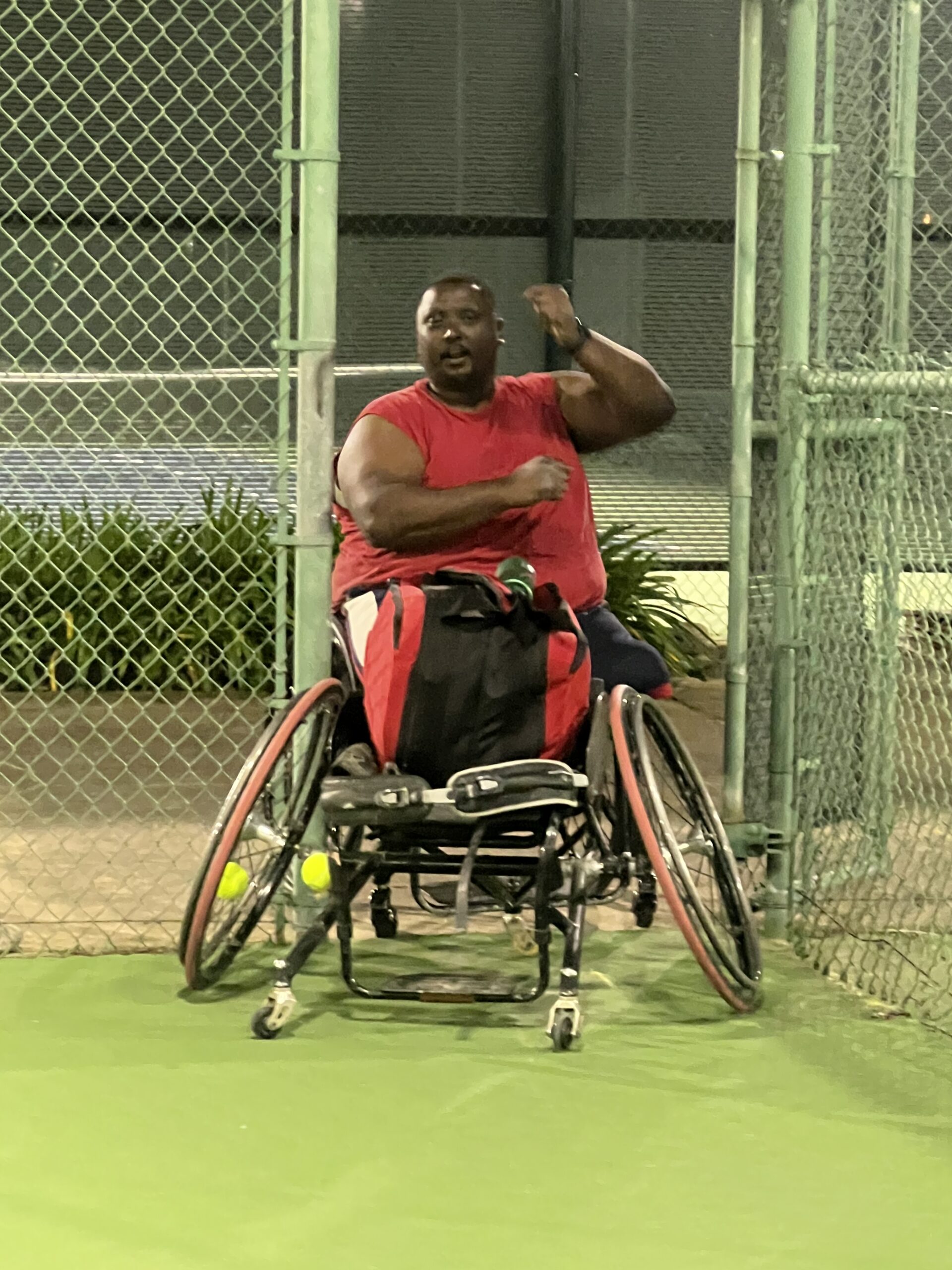 Marcus and Michael did what good doubles teams do and began to focus their shots toward Mark, our newest and least experienced player. Mark is what we call a high-level injury in wheelchair tennis, meaning his spinal cord injury is higher up near the pecs. He straps into his chair for trunk support and is still developing his strokes, with consistency coming along little by little. Despite that, he fought like a champ and absorbed a heavy workload all night.