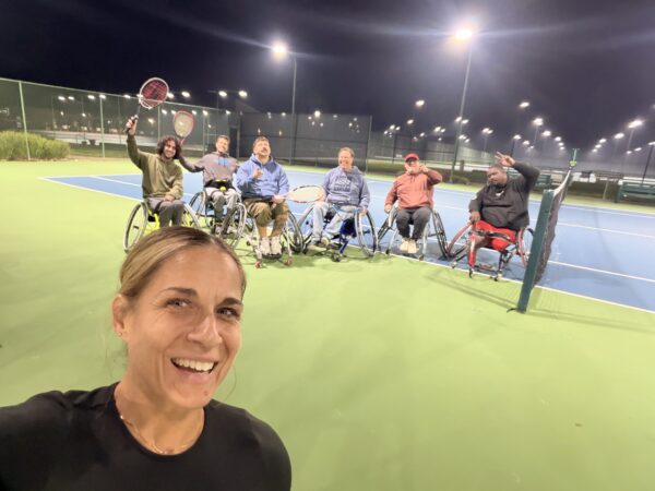 As we begin planning for the upcoming tennis season, players are starting to show up, and this past Friday we welcomed seven participants on court. It was great to have Sac State standout Bass Mansour back after his semester abroad in Canada, alongside Mark Mason, our rising beginner who continues to put in the work. Marcus Oden returned once again, fully committing to tennis as he transitions from a successful wheelchair basketball career. We also had our wily veteran Michael Lipp, professional pickleball champ and rapidly improving tennis player, Philip Peabody, our local stalwart A-level competitor, my wife, the very first wheelchair tennis junior in the sport’s history, and myself, Coach Marty.
